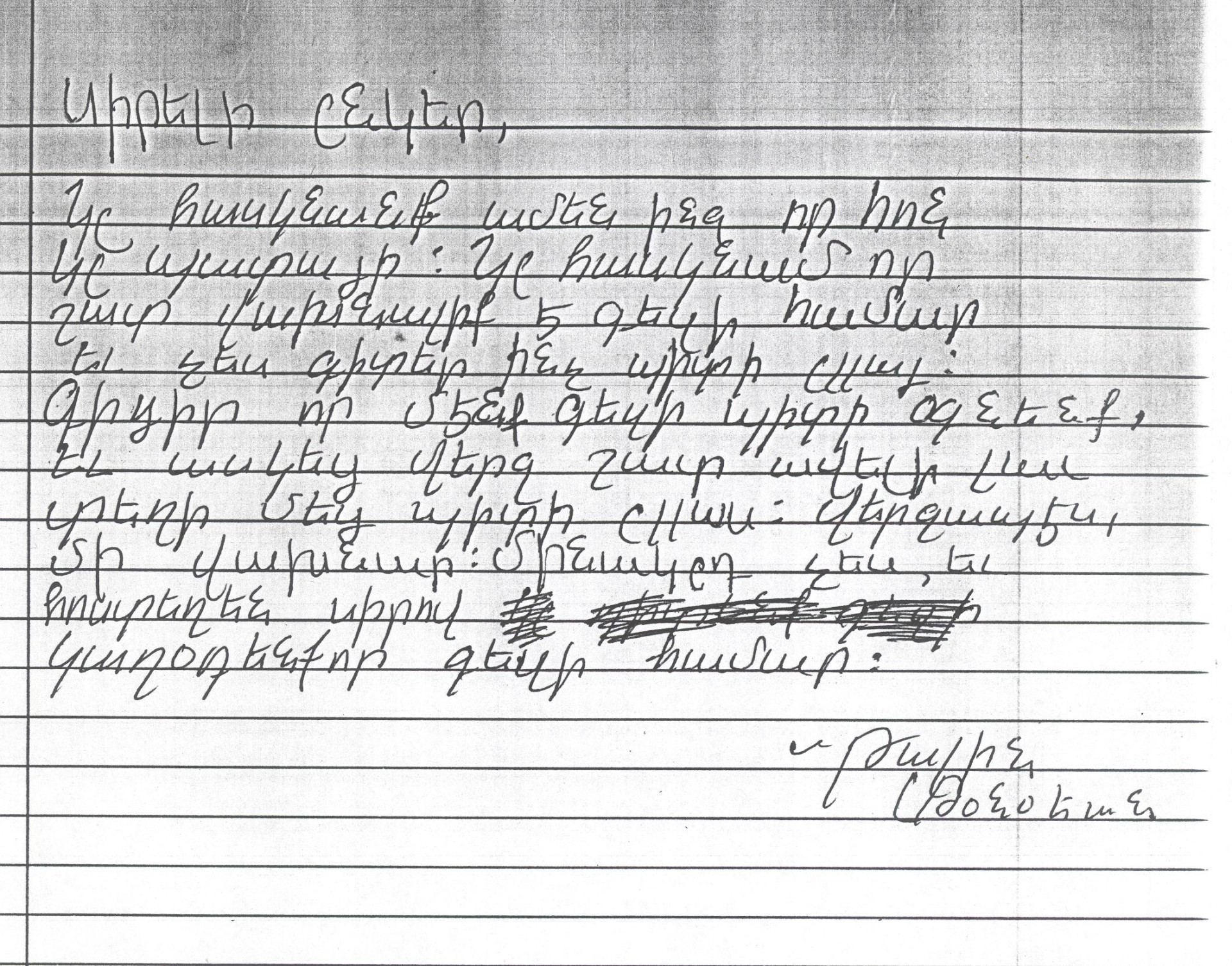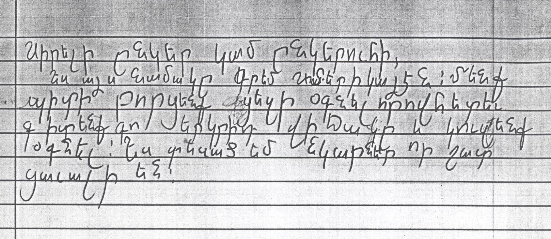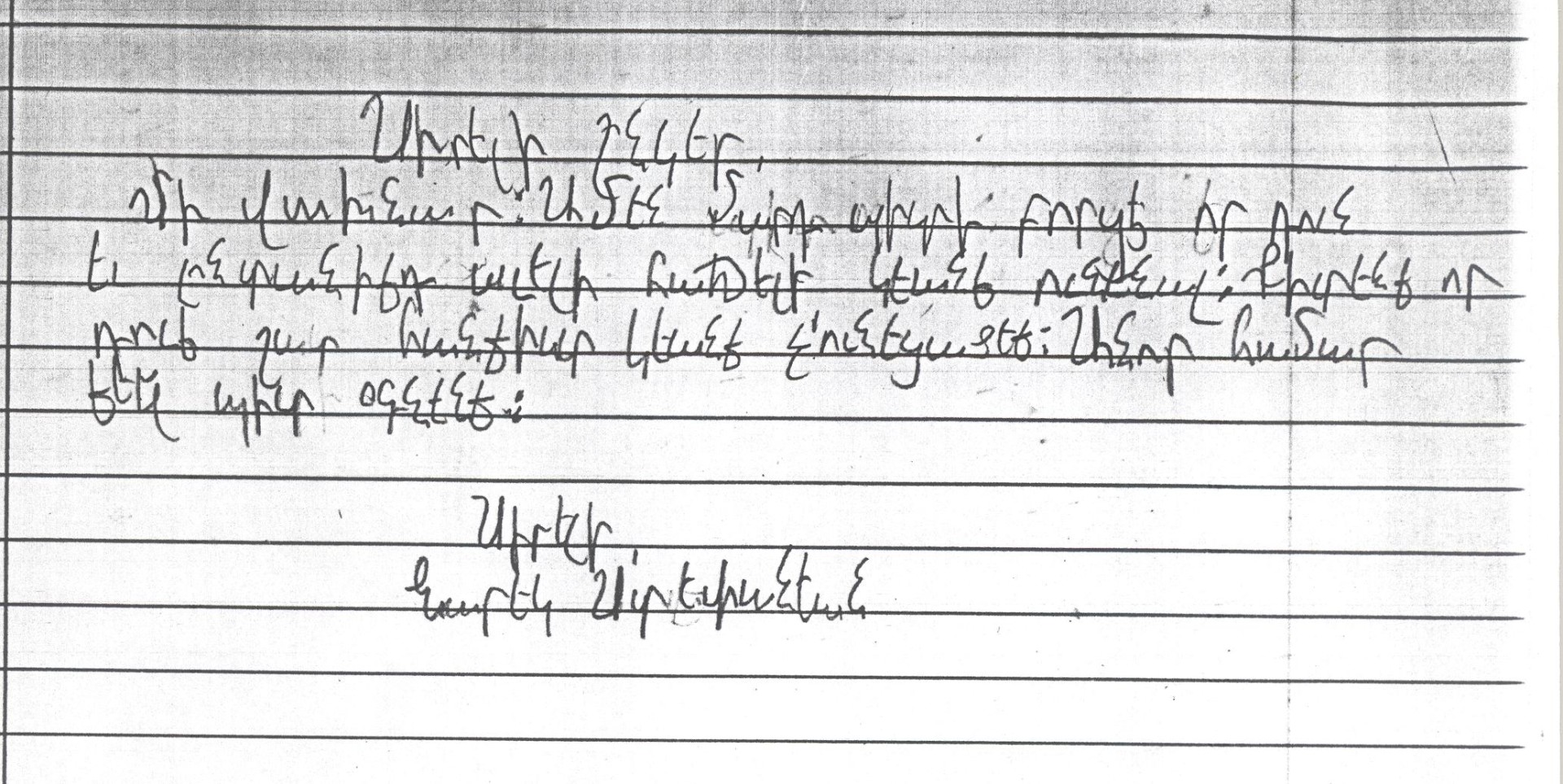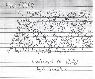 Ես այս նամակը գրեմ Ամերիկայէն: Մենք պիտի փորձենք ձեզի օգնել, որովհետեւ գիտենք քո երկրիդ վիճակը եւ կ՛ուզենք օգնել: Ես տեսած եմ նկարներ որոնք շատ ցաւալի են: