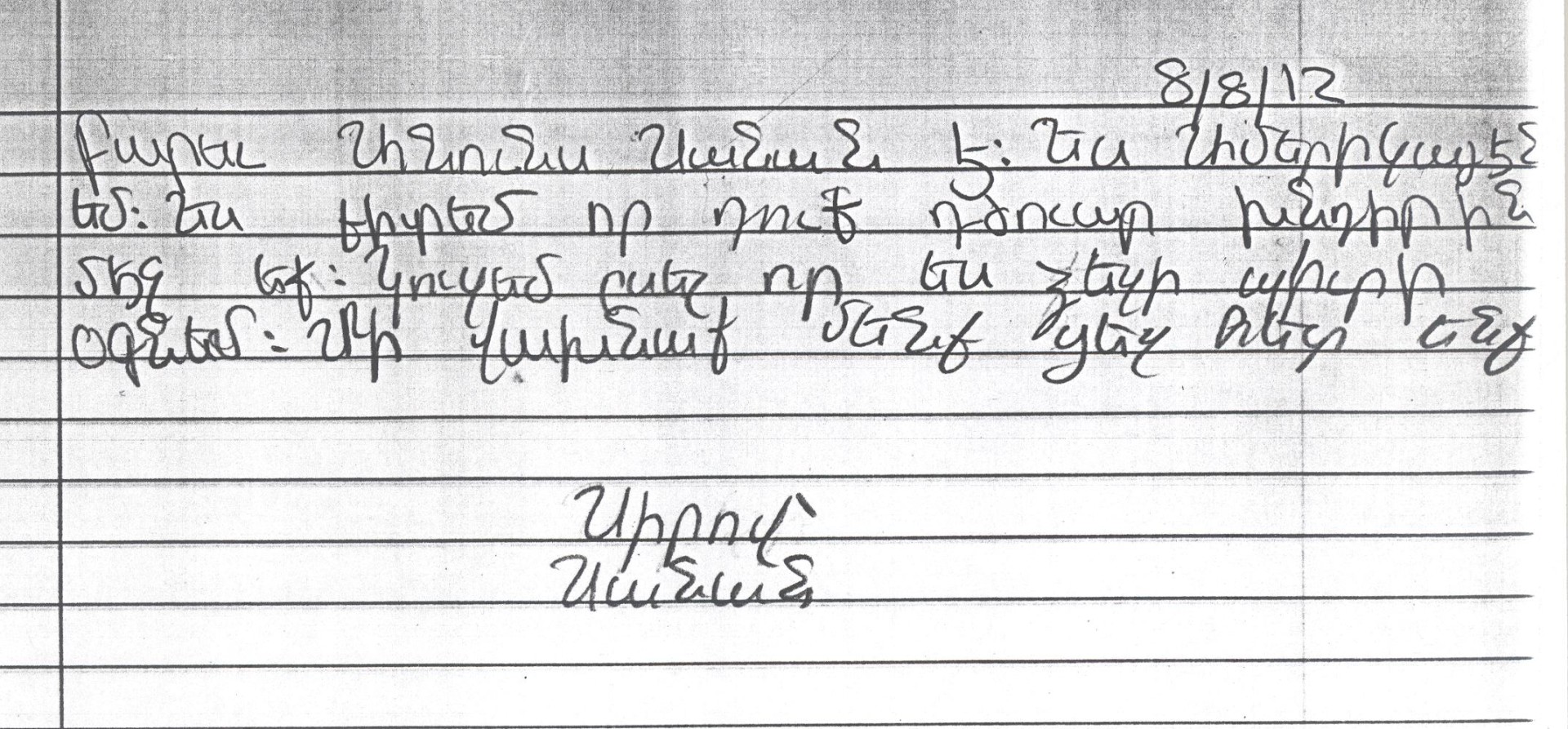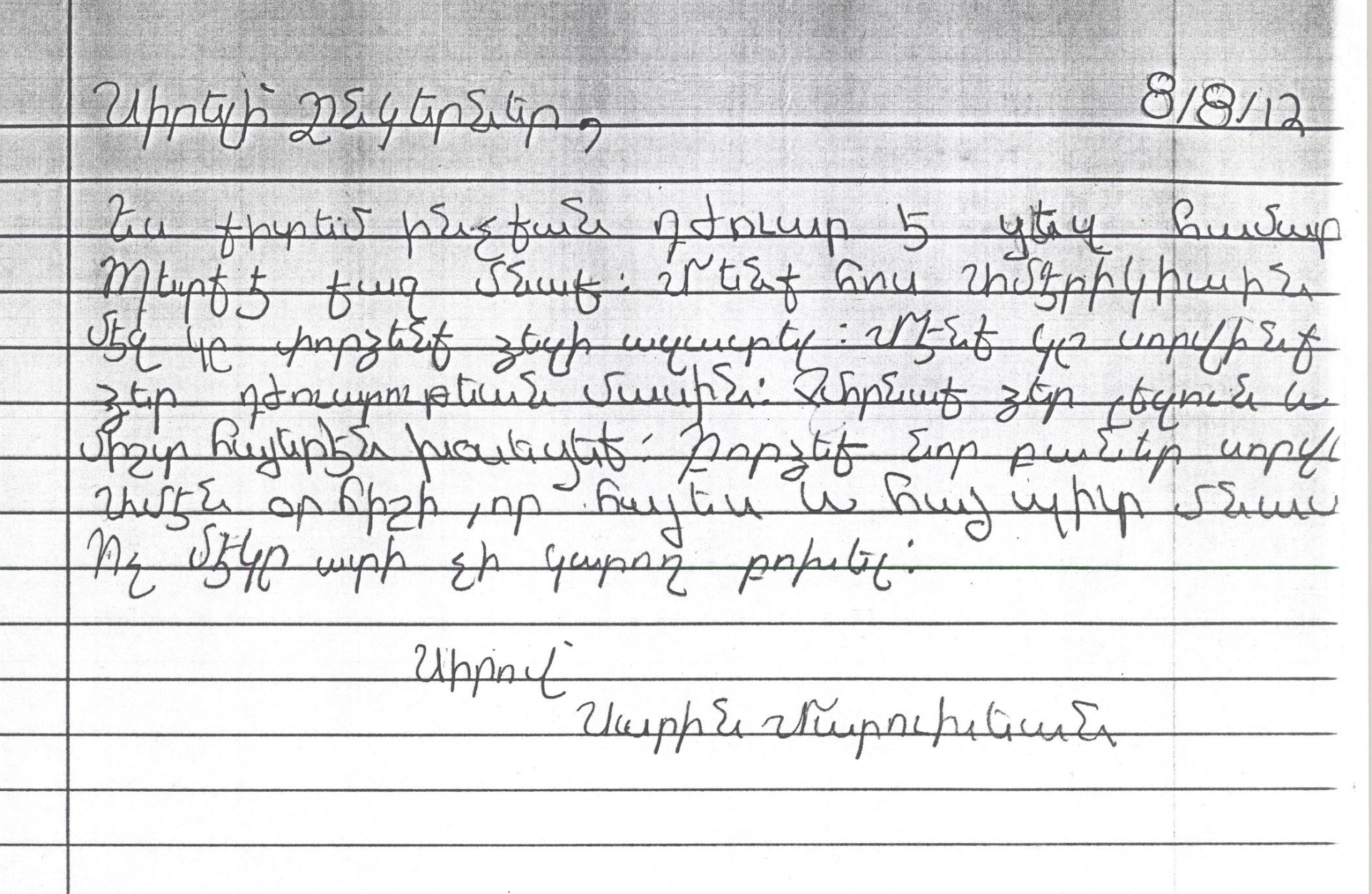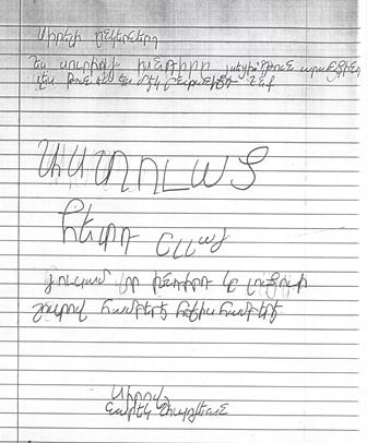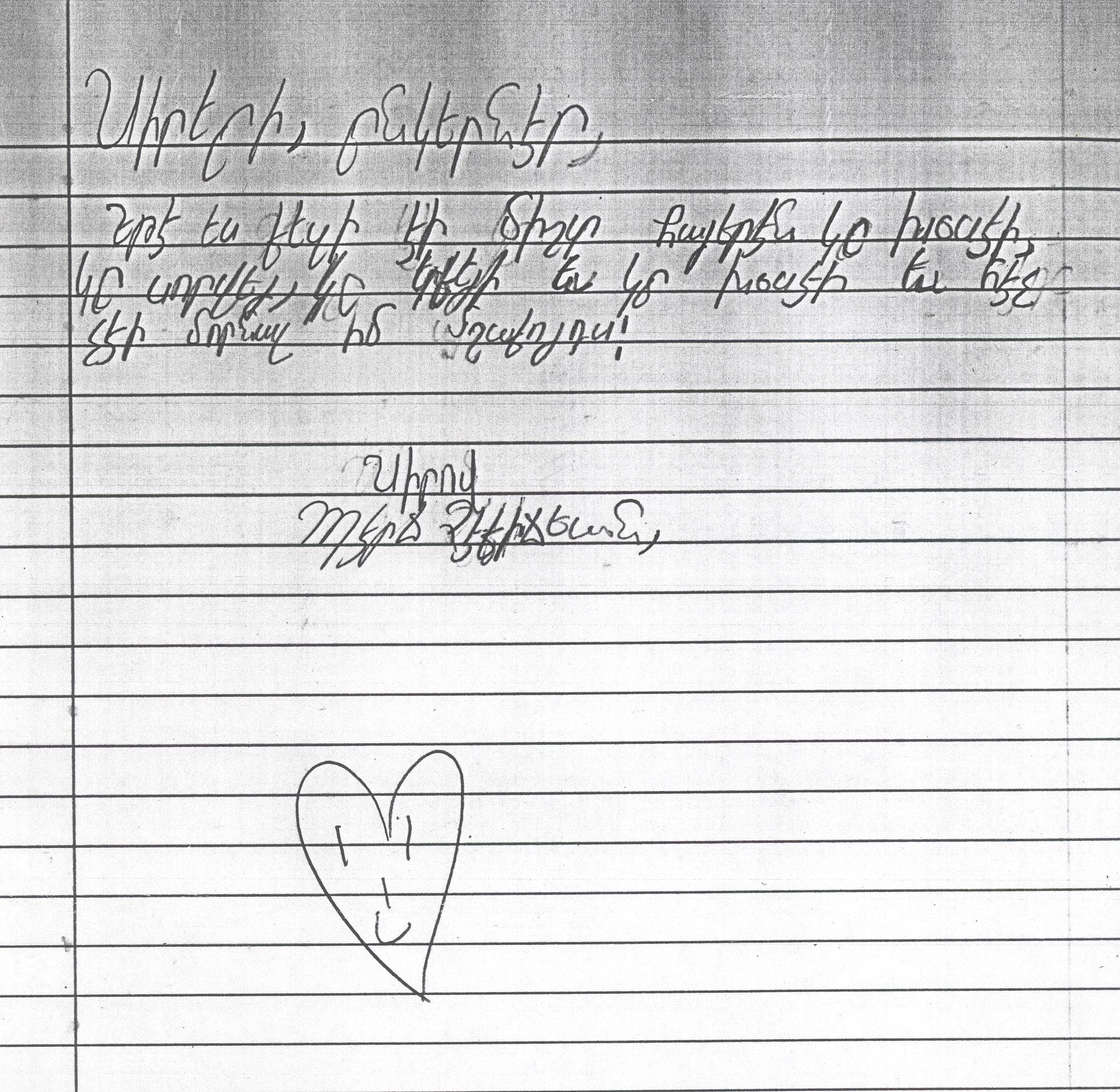 Մենք կը սորվինք Սուրիայի մասին եւ կռիւները Սուրիայի մէջ: Մենք քեզի նամակ կը գրենք, որովհետեւ մենք գիտենք ի՞նչ կը դիմանաս: Պէտք է յոյս ունենաս: Մենք կը յուսանք որ ամէն բան լաւ պիտի ըլլայ եւ ուրախ պիտի ըլլաս: